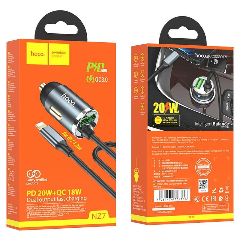 HOCO NZ7 ΦΟΡΤΙΣΤΗΣ ΑΥΤΟΚΙΝΗΤΟΥ PD20W+QC3.0 ΜΕ ΚΑΛΩΔΙΟ LIGHTNING, 2 ΘΥΡΕΣ